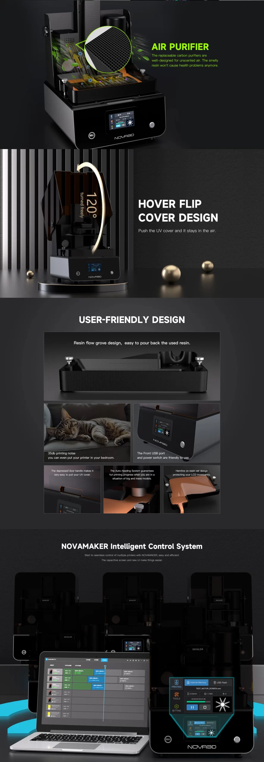 诺瓦智能NOVA3D Whale4 Ultra LCD光固化3D打印机配备10英寸16K屏幕、12mm 滚珠丝杠、双限位开关设计和第六代 COB 光源,可提供更精确、稳定和细致的打印。其增强的加热系统可确保从预热到打印过程中的持续加热始终保持一致的温度控制,消除任何与温度相关的问题。